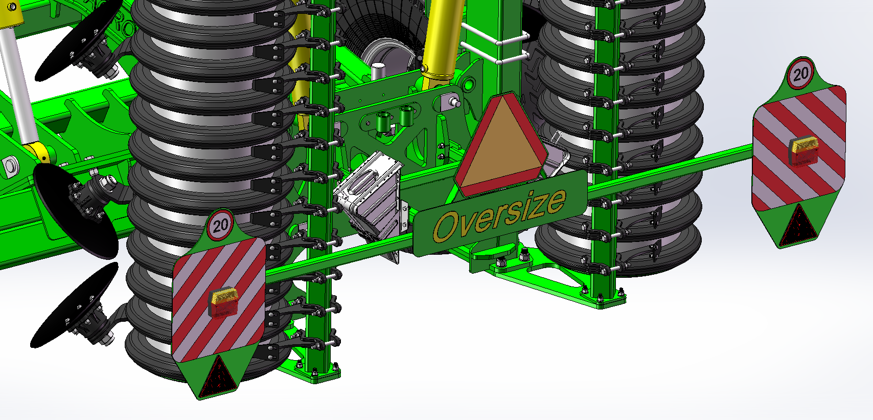 Дискові борони ZEUS HD оснащуються передніми і задніми сигнальними щитками, сигнальними ліхтарями для комфортного та безпечного транспортування.